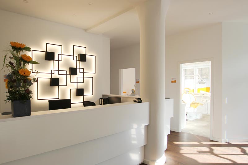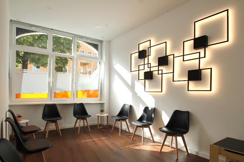 Durchstreifen Sie unsere moderne Kieferorthopädie in Treptow anhand unseres kleinen Rundgangs in Bildern. In entspanntem Ambiente mit warmen Farben, moderner Einrichtung und angenehmen Licht-Akzenten bieten wir Ihnen hier alles, um sich bei uns bei Ihrer kieferorthopädischen Behandlung wohlzufühlen.